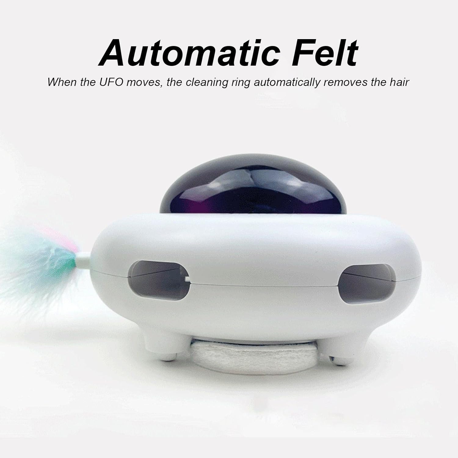 This automatic cat feather toy features an ingenious UFOshaped design, equipped with small holes along the edges to hold feathers, making it more engaging for cats. When activated in peekaboo mode, it effectively captures your cats attention with unpredictable movements.Crafted from highquality ABS and electronic materials, the toy is durable, safe, and nontoxic, ensuring it poses no harm to your cats health. Its sturdy construction offers both convenience and longlasting use.Beyond keeping your cat entertained, this interactive toy also serves a practical functionit helps remove loose cat fur from floors thanks to the cleaning ring attached underneath. Its an ideal solution for busy pet owners, as it keeps cats occupied even when youre not available to play.The toy offers three speed modesslow, normal, and acceleratedallowing you to choose the most suitable pace to keep your cat active and engaged. It automatically turns on every 5 minutes within a 4hour cycle, encouraging regular activity.Powered by a builtin 500mAh lithium battery that charges via USB, it provides 23 hours of continuous use. Additional features include internal automatic electric springs and a fivewheel base for smooth direction changes.With its unique design and multiple functions, this automatic feather toy makes a perfect gift for cat ownersgiving them more free time while keeping their pets happily entertained for hours.SpecificationsMaterial ABS Electronic componentsSize Diameter approx. 15.6 9.2 cm 6.14 3.62 inchesPackage Includes Automatic cat feather toy USB charging cable Replacement springs
